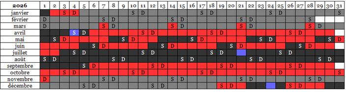 Haute saison: noir, moyenne saison: rouge, basse saison: gris, Fête: bleu